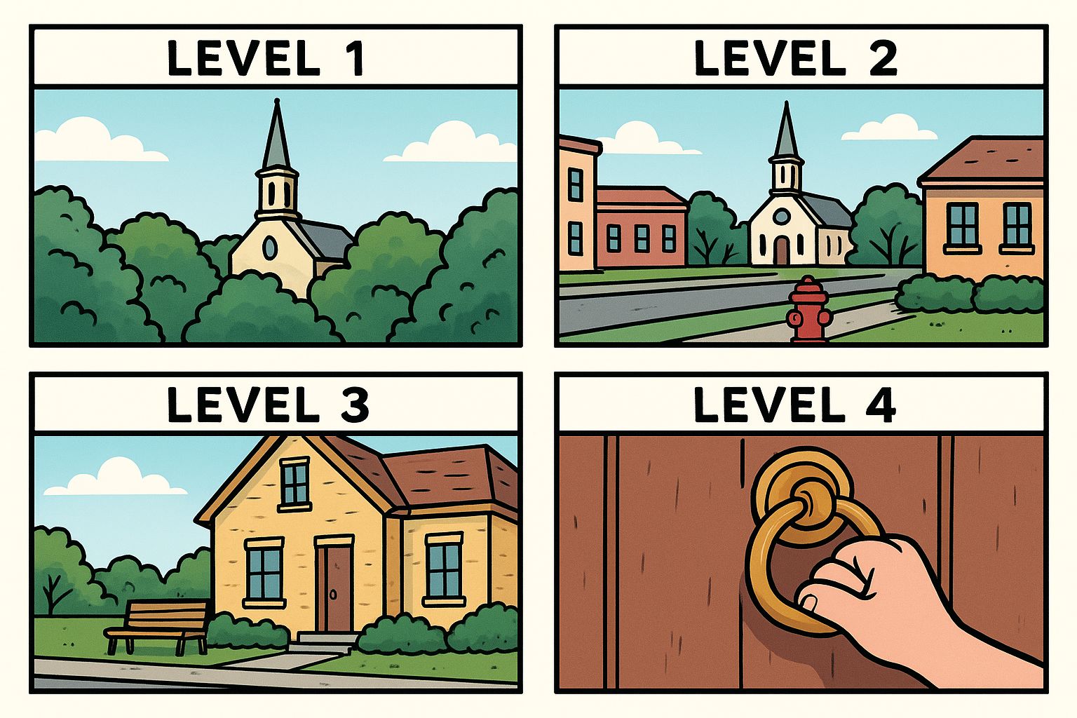 Level 4: You’re at the front door, gripping the door knocker. You feel the coolness of the metal, the chipped paint, the dents from decades of use.